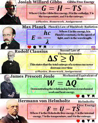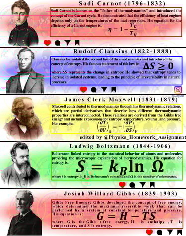 Thermodynamics, the study of heat, energy, and work, has been shaped by the contributions of many great scientists. Sadi Carnot, known as the "father of thermodynamics," introduced the concept of the Carnot cycle, which laid the foundation for understanding heat engines and efficiency. Rudolf Clausius expanded on Carnot’s ideas by formulating the second law of thermodynamics and introducing the concept of entropy, a measure of disorder in a system. James Clerk Maxwell contributed by developing kinetic theory, which describes how gas molecules move and exchange energy, leading to a deeper understanding of temperature and pressure.